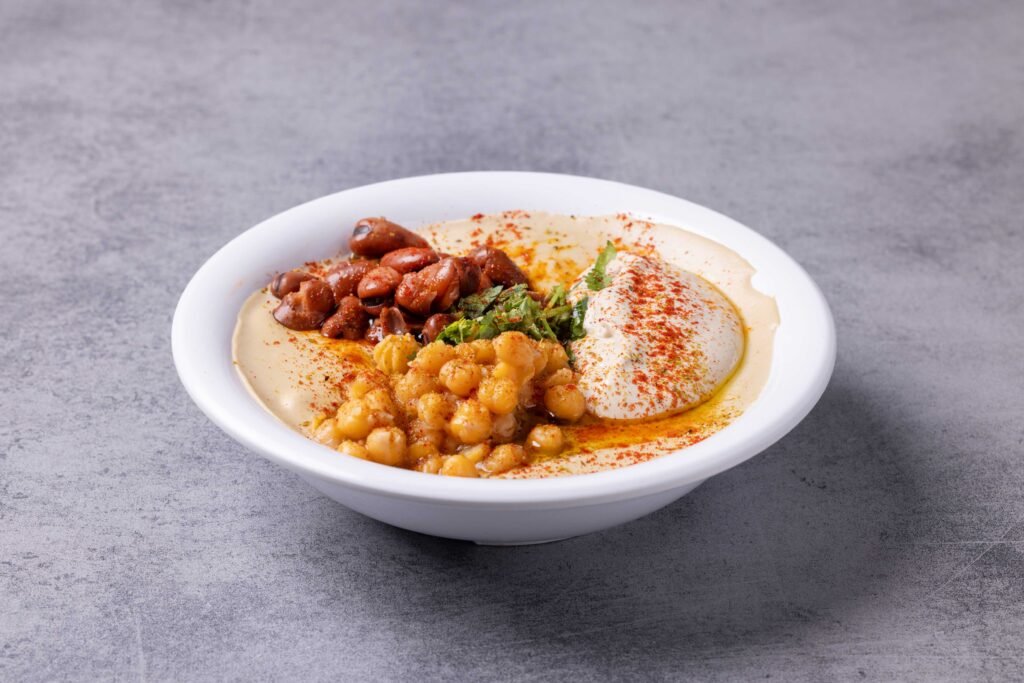גרגירי חומוס חמים , טחינה , פול, שמן זית תבלינים ופטרוזיליה